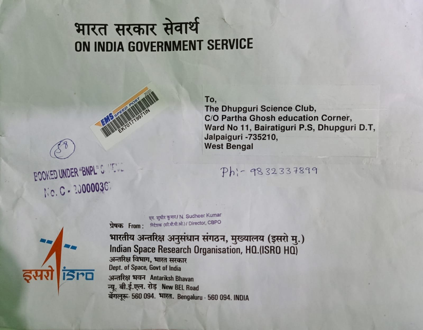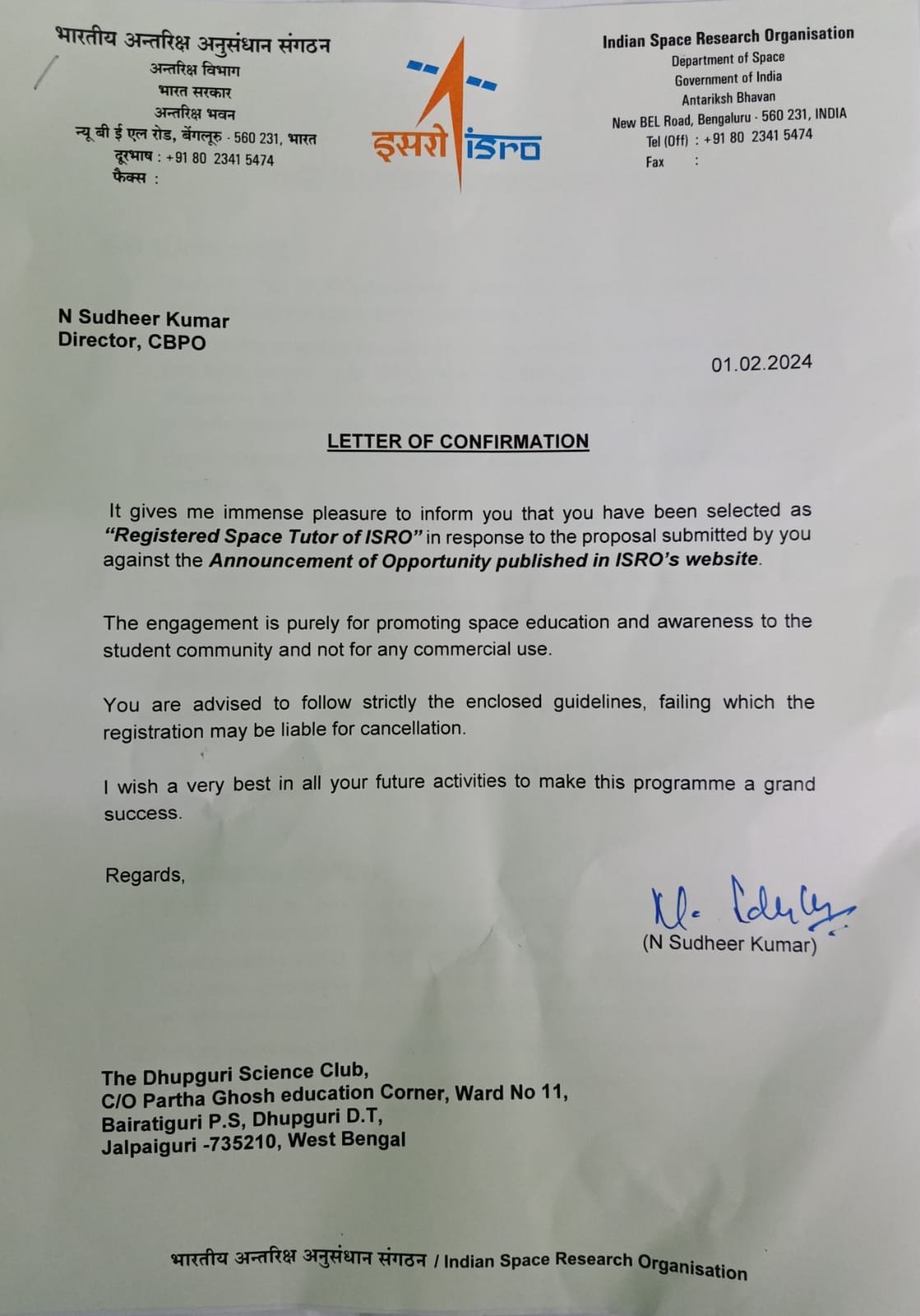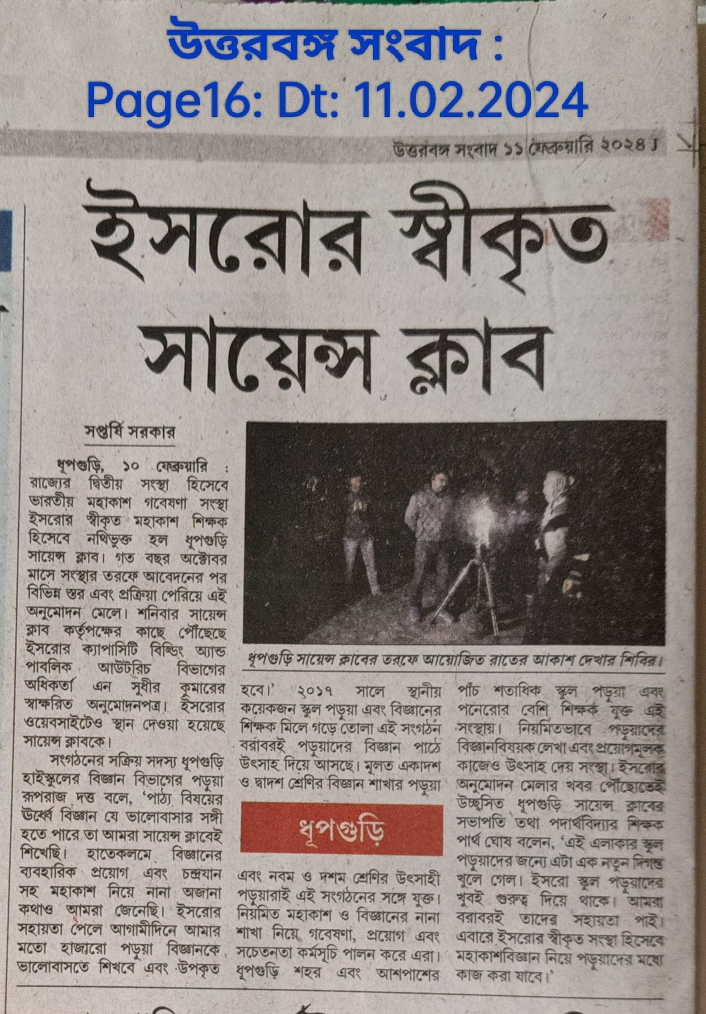 ISRO accepted Dhupguri Science Club as registered space tutor